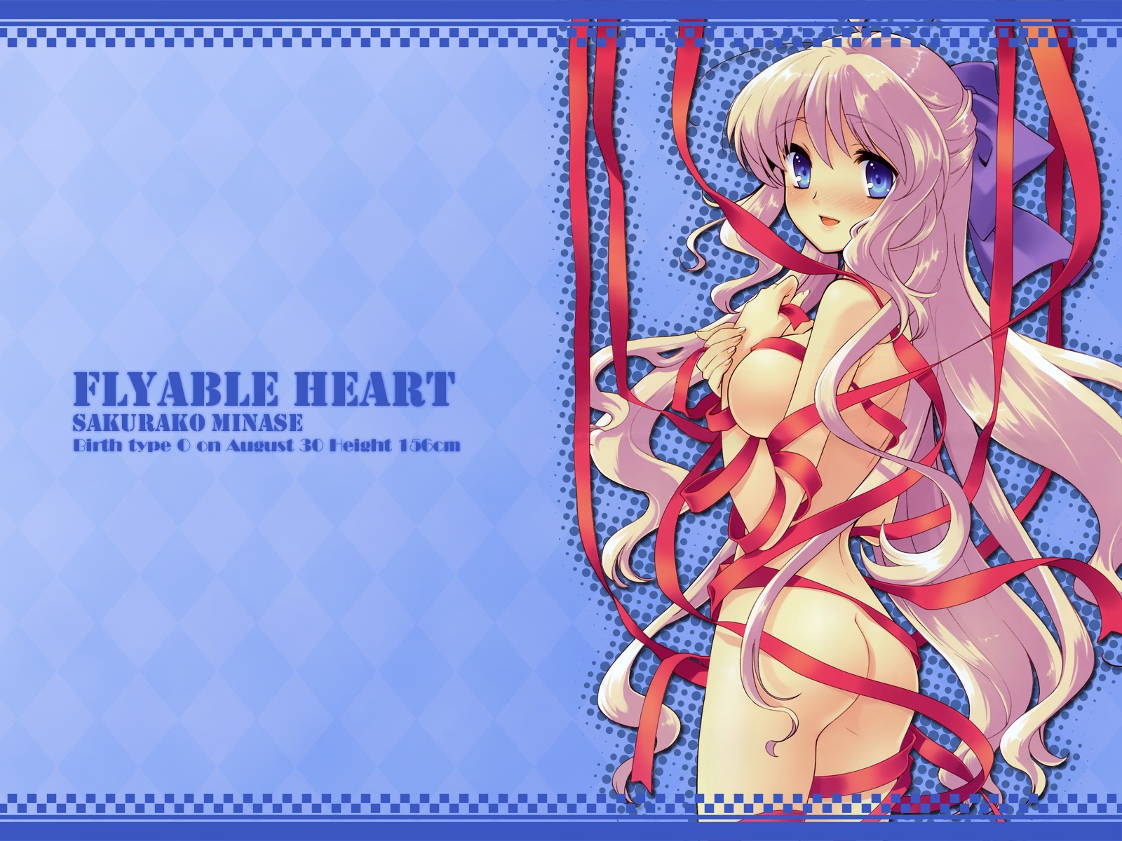 作品 :FlyableHeartキャラ:水無瀬桜子サイズ:UXGAツール:Adobe Photoshop 7.0友人に頼まれて即席で作った作品。文字関連をうまく入れてたかったので練習品。PNG版、サイズ別(WUXGA,UXGA,SXGA)については以下参照http://www.geocities.jp/seiya_saiga/fh3.zip