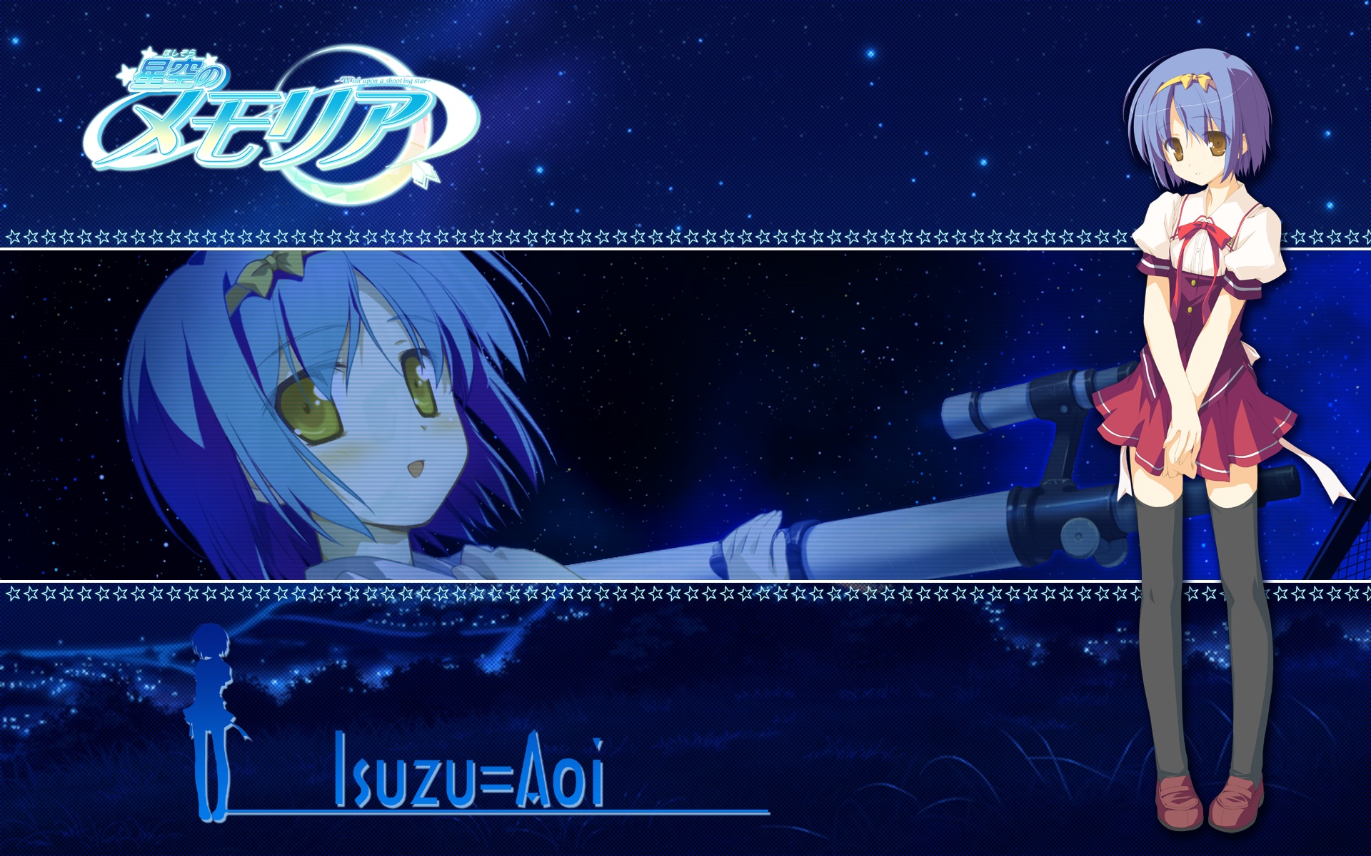 作品 :星空のメモリアキャラ:蒼衣鈴サイズ:WUXGA,UXGA,SXGAツール:Adobe Photoshop 7サイズ別(WUXGA,UXGA,SXGA)については以下参照http://www.geocities.jp/seiya_saiga/isuzu.zip