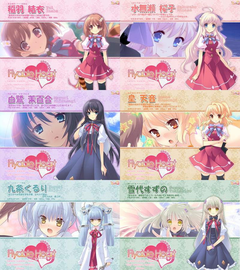 作品 :FlyableHeartキャラ:稲羽結衣、水無瀬桜子、白鷺茉百合、魔百合、皇天音、九条くるり、雪代すずのサイズ:WUXGA,UXGA,SXGAツール:Adobe Photoshop 7サイズ別(WUXGA,UXGA,SXGA)については以下参照結衣http://www.geocities.jp/seiya_saiga/flyableheart1.zip桜子http://www.geocities.jp/seiya_saiga/flyableheart2.zip茉百合http://www.geocities.jp/seiya_saiga/flyableheart3a.zip魔百合http://www.geocities.jp/seiya_saiga/flyableheart3b.zip天音http://www.geocities.jp/seiya_saiga/flyableheart4.zipくるりhttp://www.geocities.jp/seiya_saiga/flyableheart5.zipすずのhttp://www.geocities.jp/seiya_saiga/flyableheart6.zip